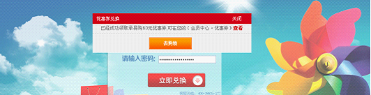 三、登录后,请输入您获得的兑奖代码及密码,点击“立即兑换“,请详细阅读礼券的使用规则。