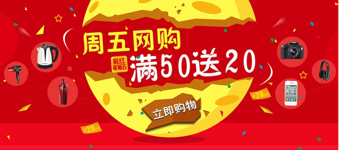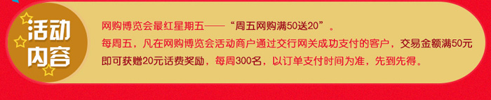 活动主题:交行网上支付用户尊享“最红星期五”——“每周五网购满50送20”。