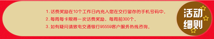 1、话费奖励在10个工作日充入您在交行留存的手机号码中。