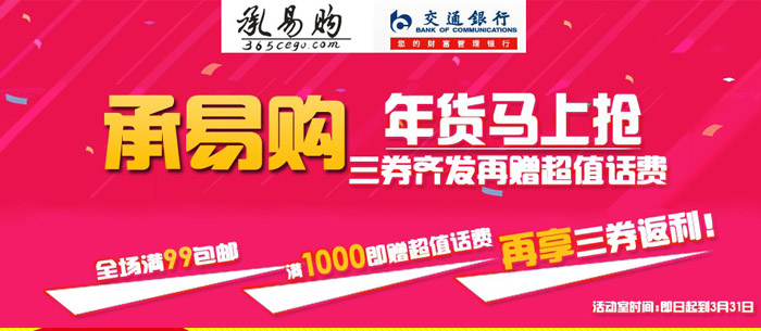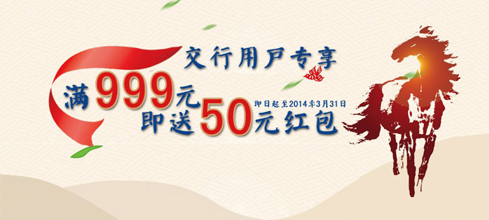 即日起至2014年3月31日,承易购交行用户专享:满999送50元红包,限量50名;每周五网购还可参加交行官方“最红星期五”活动——周五网购前300名,满50送20。亲们,先到先得,早买早享受,要抓紧哦!