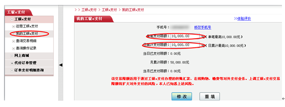 2.选择我的工银e支付—设定单笔支付限额及日累计支付限额
